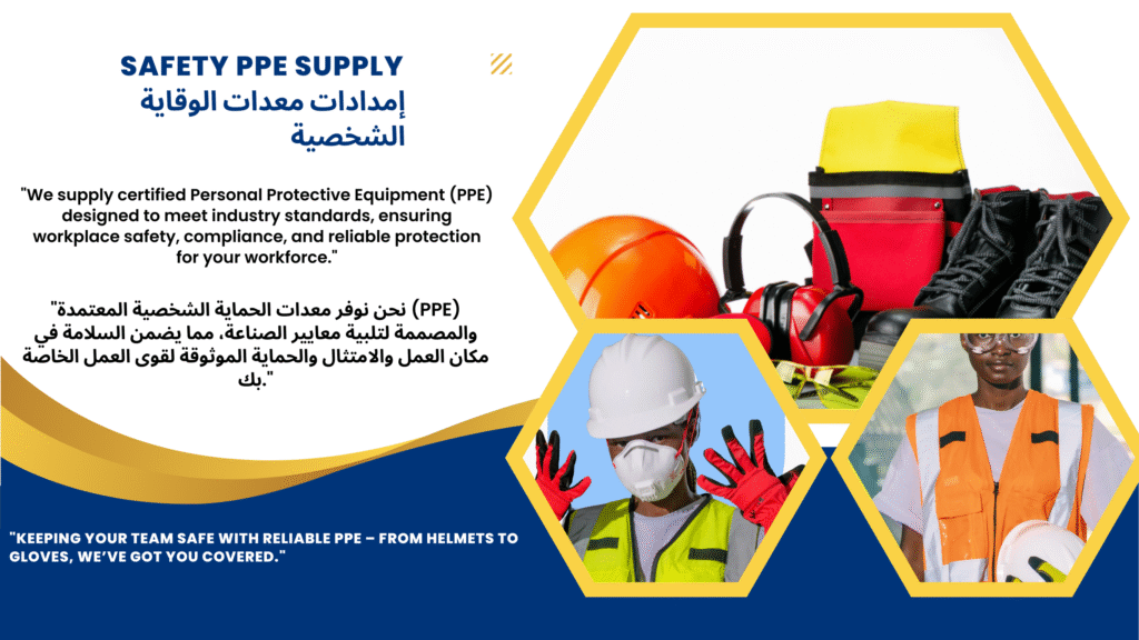 “We provide a complete range of certified Personal Protective Equipment (PPE) designed to meet international safety standards and ensure maximum protection in the workplace. From helmets, gloves, masks, and safety shoes to specialized gear for industrial environments, our products are durable, reliable, and trusted by professionals across sectors. At Noor Group, we are committed to supporting workplace safety by delivering high-quality PPE that safeguards workers, prevents risks, and promotes a culture of protection and care.”